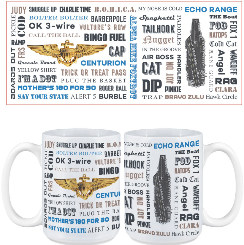 Naval Air "Say Again" Mug. Has accurate language used by pilots and aircrews used during aircraft carrier flight operations. Each mug has more than 40 abbreviations, lingo, call-outs and other communication. Includes Burble, Cold Cat, Trick Or Treat Pass, and more. This version good for any pilot, any era and all aircraft deployed on an aircraft carrier past and present. This has Navy Aviator Wings; See companion mug for Navy Flight Officer wings.